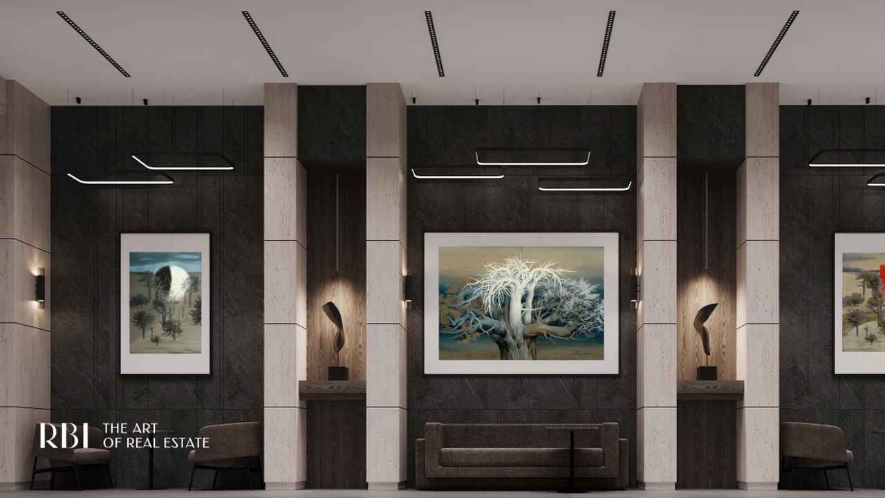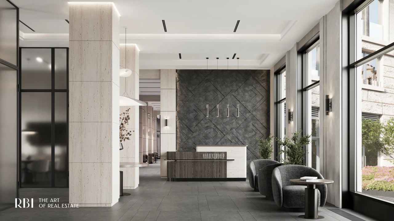 Внутреннее пространство лобби отличается высокими потолками до 4 метров и оформлено в светлых тонах с использованием натуральных материалов. Здесь размещена пинакотека, где представлены работы художника Латифа Казбекова и скульптора Виктора Грачёва. Для жителей доступна стойка ресепшен, где можно забронировать переговорную комнату, а также кофе-поинт.