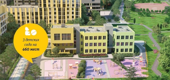 - Для детей построены современные общеобразовательные и дошкольные учреждения. Также предусмотрен спортивный комплекс для малышей и подростков.