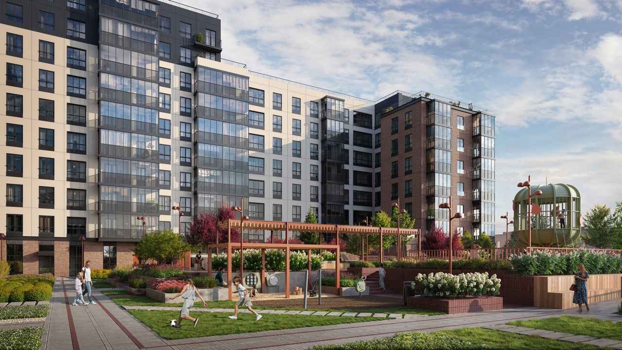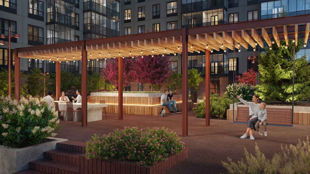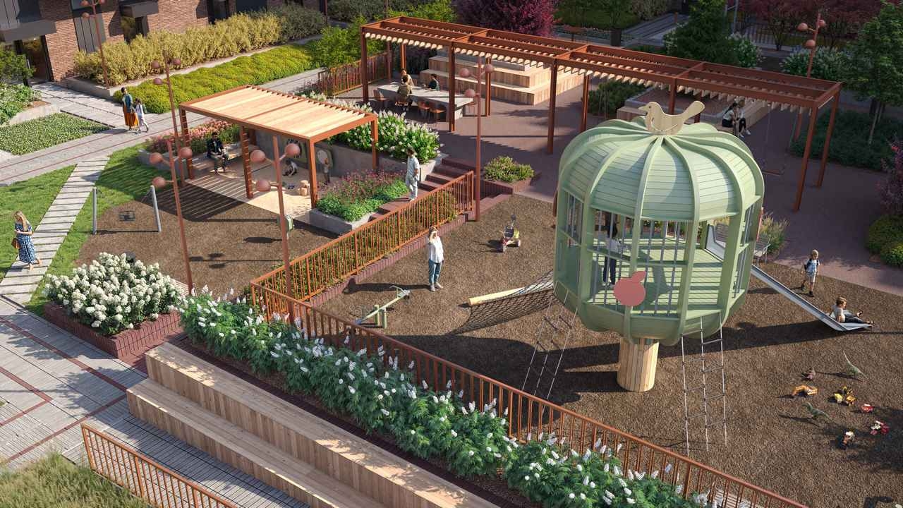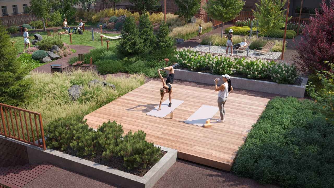 Благоустройство включает дождевые сады с экологически чистым дренажом, игровые площадки для различных возрастных групп, а также зоны для отдыха взрослых: тихие уголки, настилы для занятий йогой и теннисный стол.