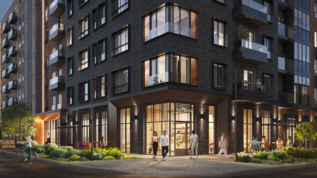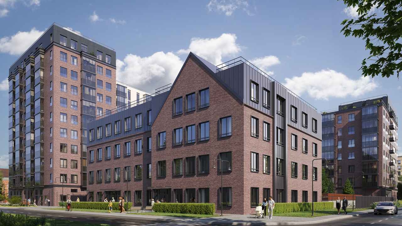 Фасады выполнены в спокойной палитре, гармонирующей с историческим обликом района, и облицованы фактурным бетоном и клинкерной плиткой с акцентными металлическими элементами.